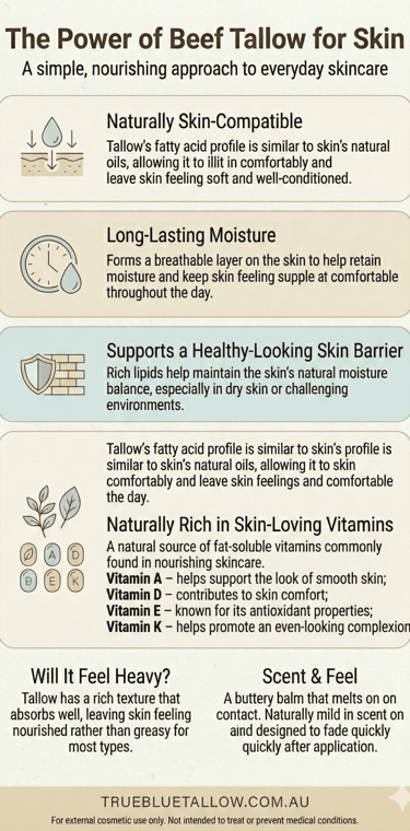 True Blue Tallow balms are handcrafted in small batches in Melbourne using 100% Australian grass-fed tallow and carefully selected cosmetic ingredients. Our approach focuses on straightforward formulations designed for everyday cosmetic use.