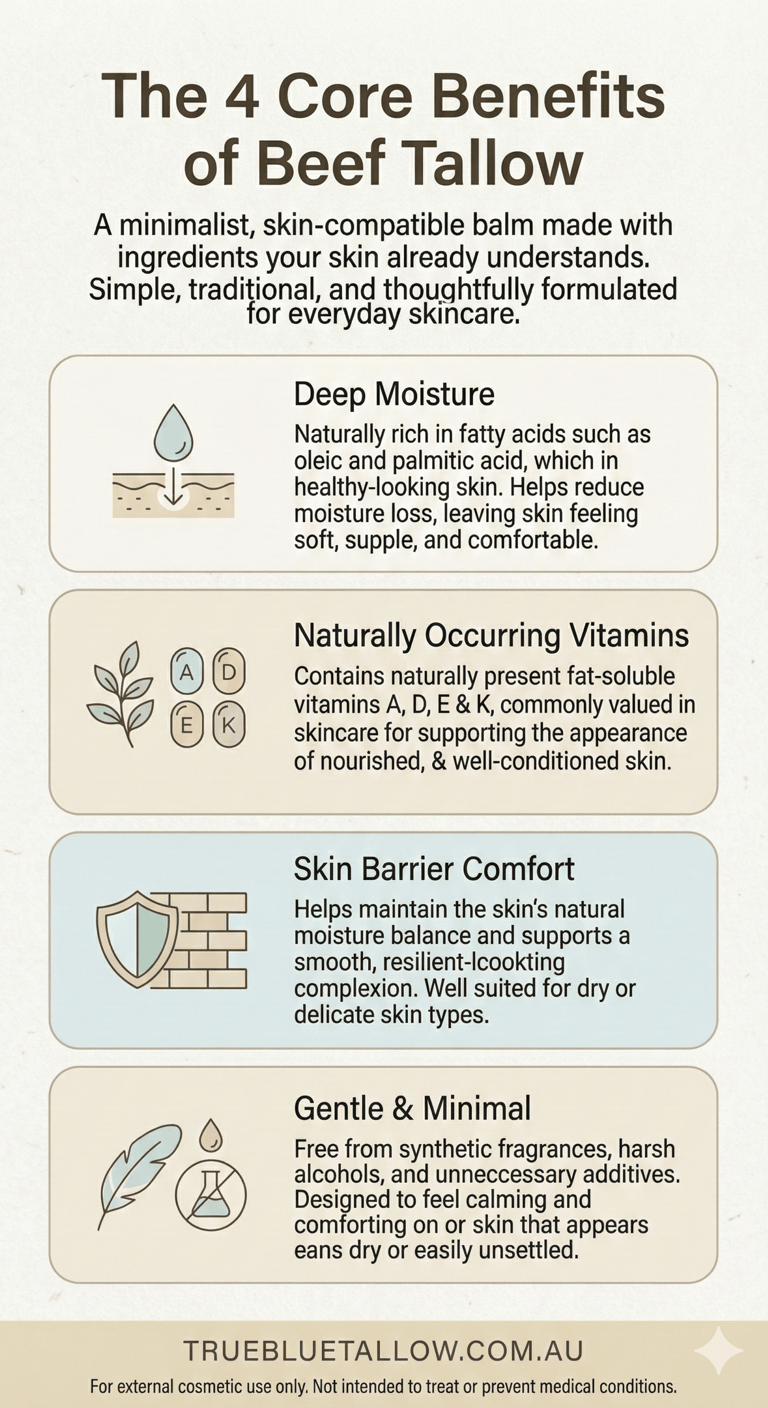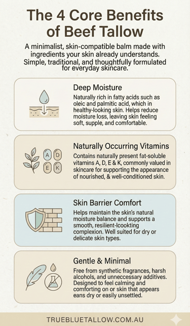 For those who find their skin reacts to complex formulas, tallow offers a simple, "no-fuss" alternative. Pure tallow balms are often free from the synthetic fragrances, alcohols, and harsh preservatives that can contribute to skin feeling irritated. Its natural composition is inherently gentle, making it ideal for soothing skin prone to feelings of redness, dryness, or discomfort.